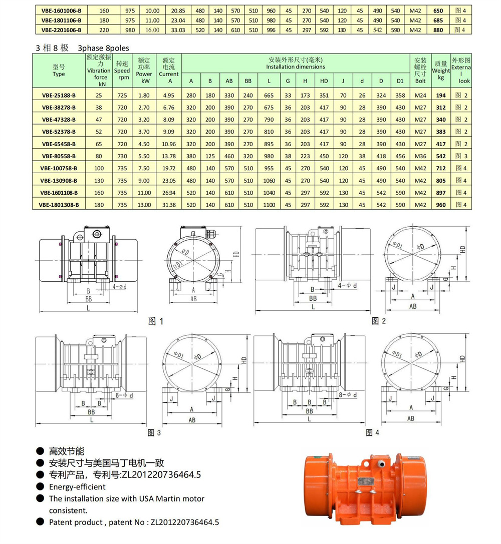 VBE系列高效节能三相异步振动电机运用大量新技术、新工艺、新材料,具有高效节能,其效率高于国家标准2~2.5个百分点,安装尺寸与 VBE系列高效节能振动电机国际接轨,与美国马丁公司电机安装尺寸完全一致。全系列电机体积小、重量轻、外型美观,综合性能远优于国内同类产品的综合优势。