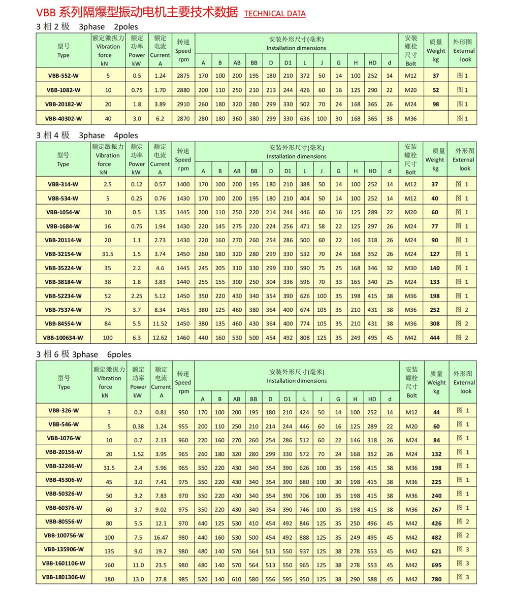 VBB系列隔爆型振动电机,功率0.2~13KW,2、4、6、8极,激振力为3~180KN,共计25个规格。